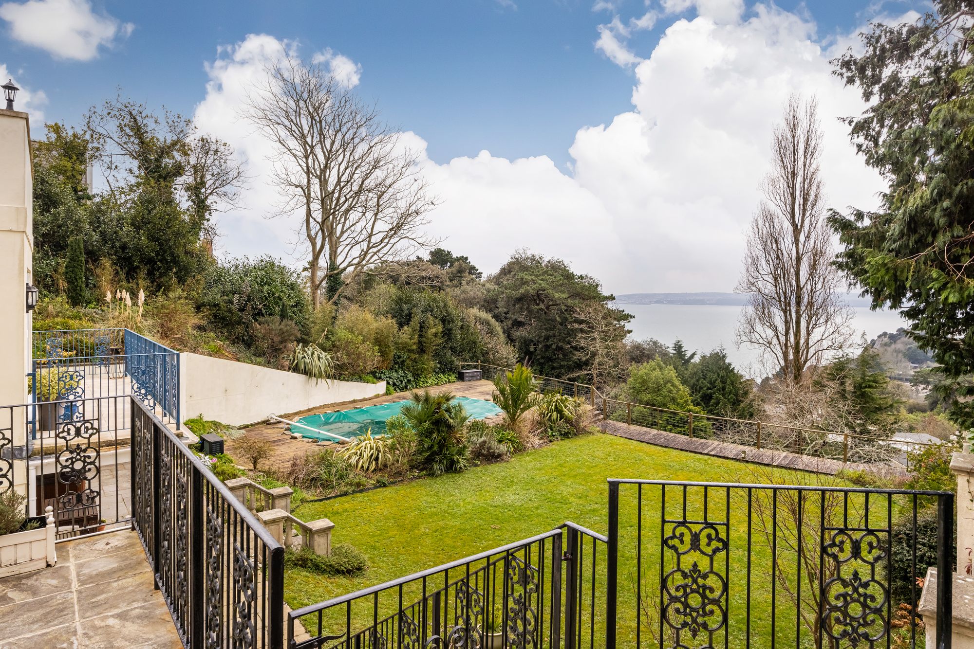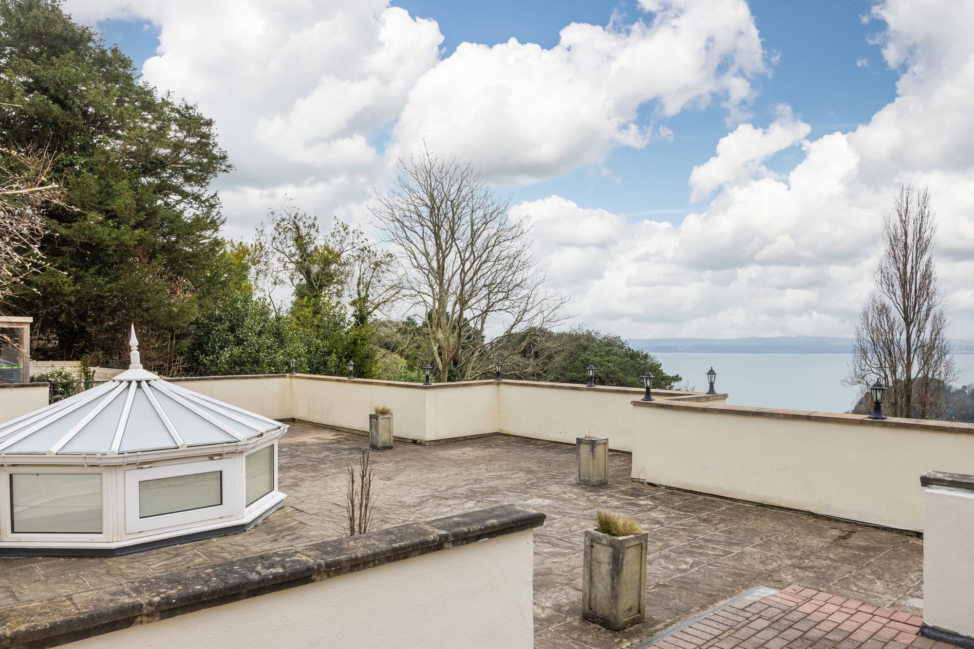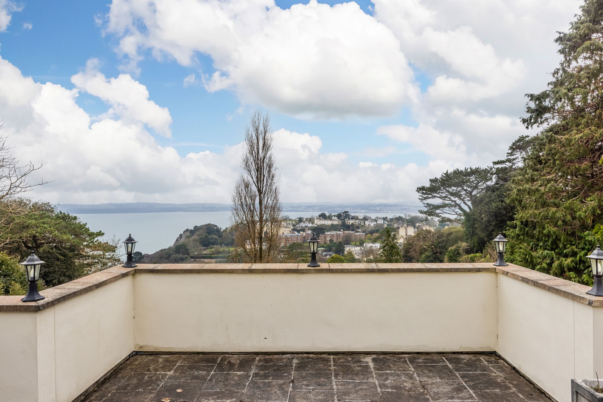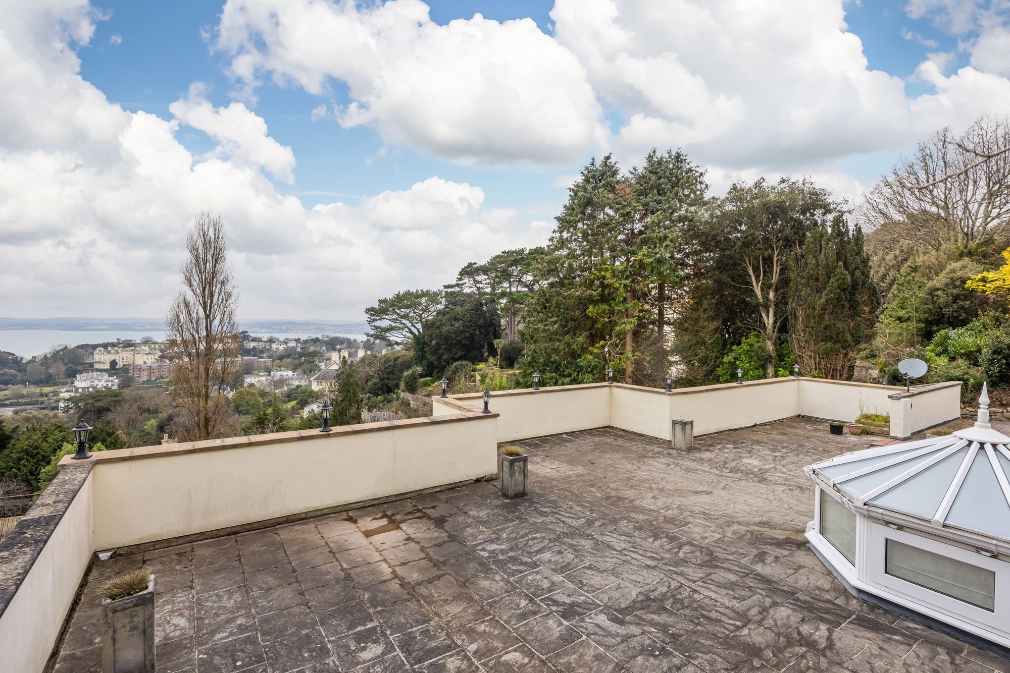 The spacious accommodation offers 5 bedrooms, 4 have ensuites with the principle bedroom having the benefit of a private dressing room and sauna. The living accommodation is beautifully presented with the dining room featuring marble floors, vaulted ceiling and spectacular glazed roof lantern providing lots of natural light. The sitting room, kitchen and first floor bedroom all have doors that lead to the full length balcony with views over the garden, Tor Bay and over to Brixham.