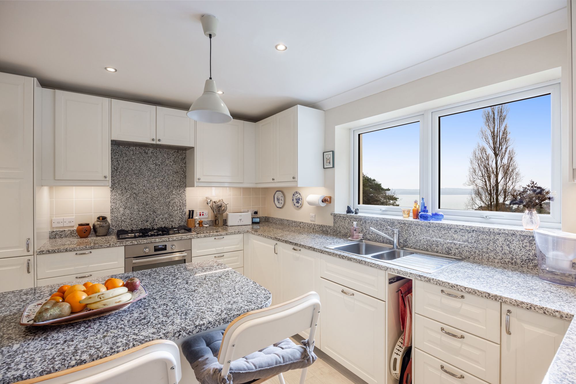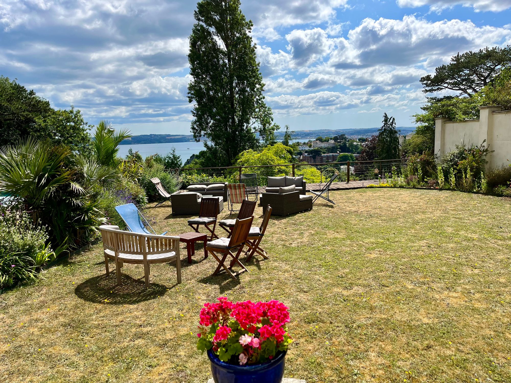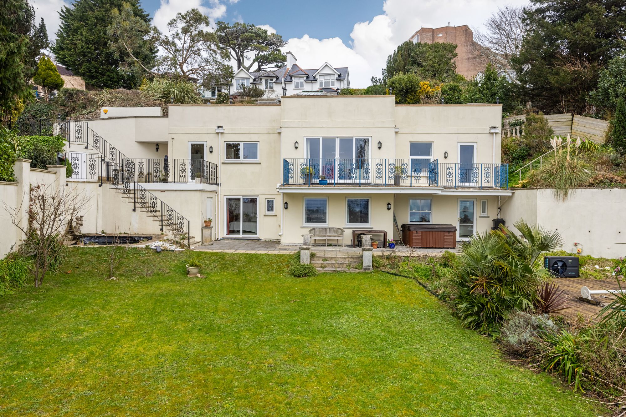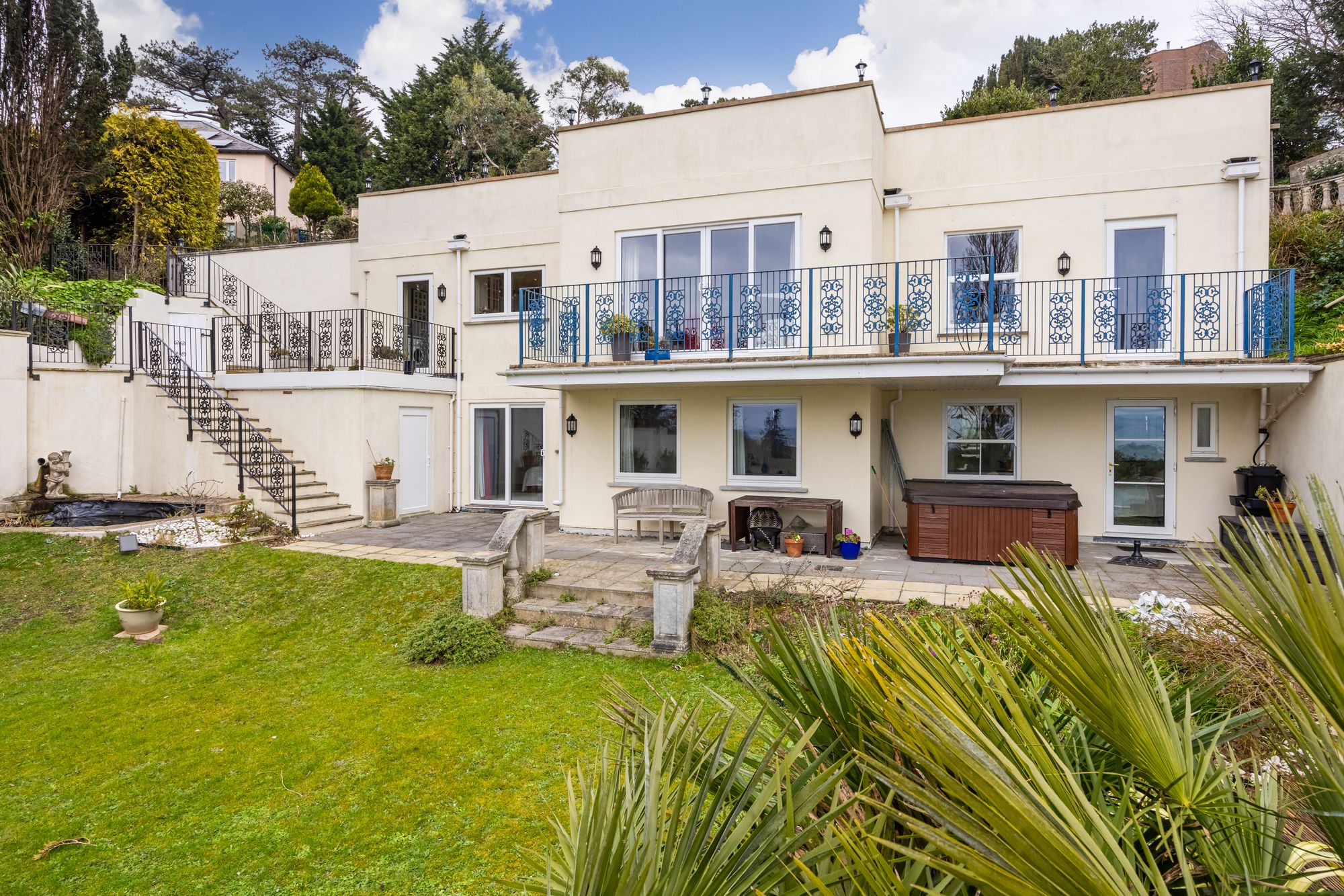 The spacious accommodation offers 5 bedrooms, 4 have ensuites with the principle bedroom having the benefit of a private dressing room and sauna. The living accommodation is beautifully presented with the dining room featuring marble floors, vaulted ceiling and spectacular glazed roof lantern providing lots of natural light. The sitting room, kitchen and first floor bedroom all have doors that lead to the full length balcony with views over the garden, Tor Bay and over to Brixham.