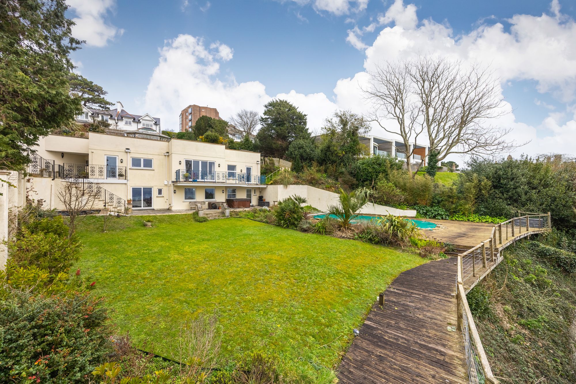 Eden Grange is a modern detached marine home of individual design occupying an exceptional position on the prestigious Lincombes hillside and takes full advantage of the SEA VIEWS over Tor Bay to Brixham. Built in 2003, the property faces due south with private gardens, heated swimming pool and hot tub, whilst the reverse level accommodation has been designed with the views and outside space in mind.